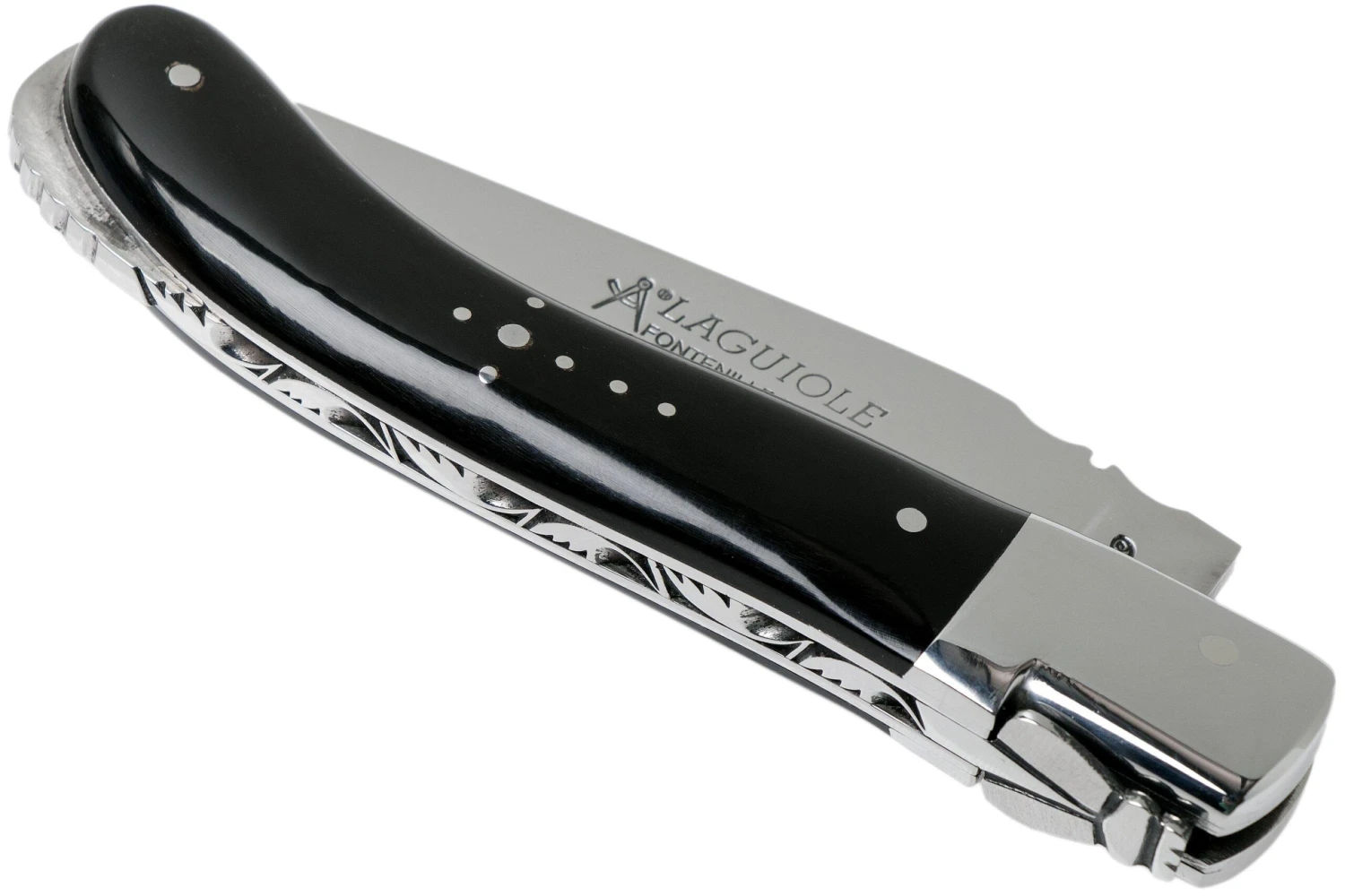 Authentique couteau Laguiole, entièrement fait à la main. Longueur fermé : 13 cm. Lame en acier inoxydable suédois 12c27, manche en pointe de corne de buffle et mécanisme de verrouillage de lame.